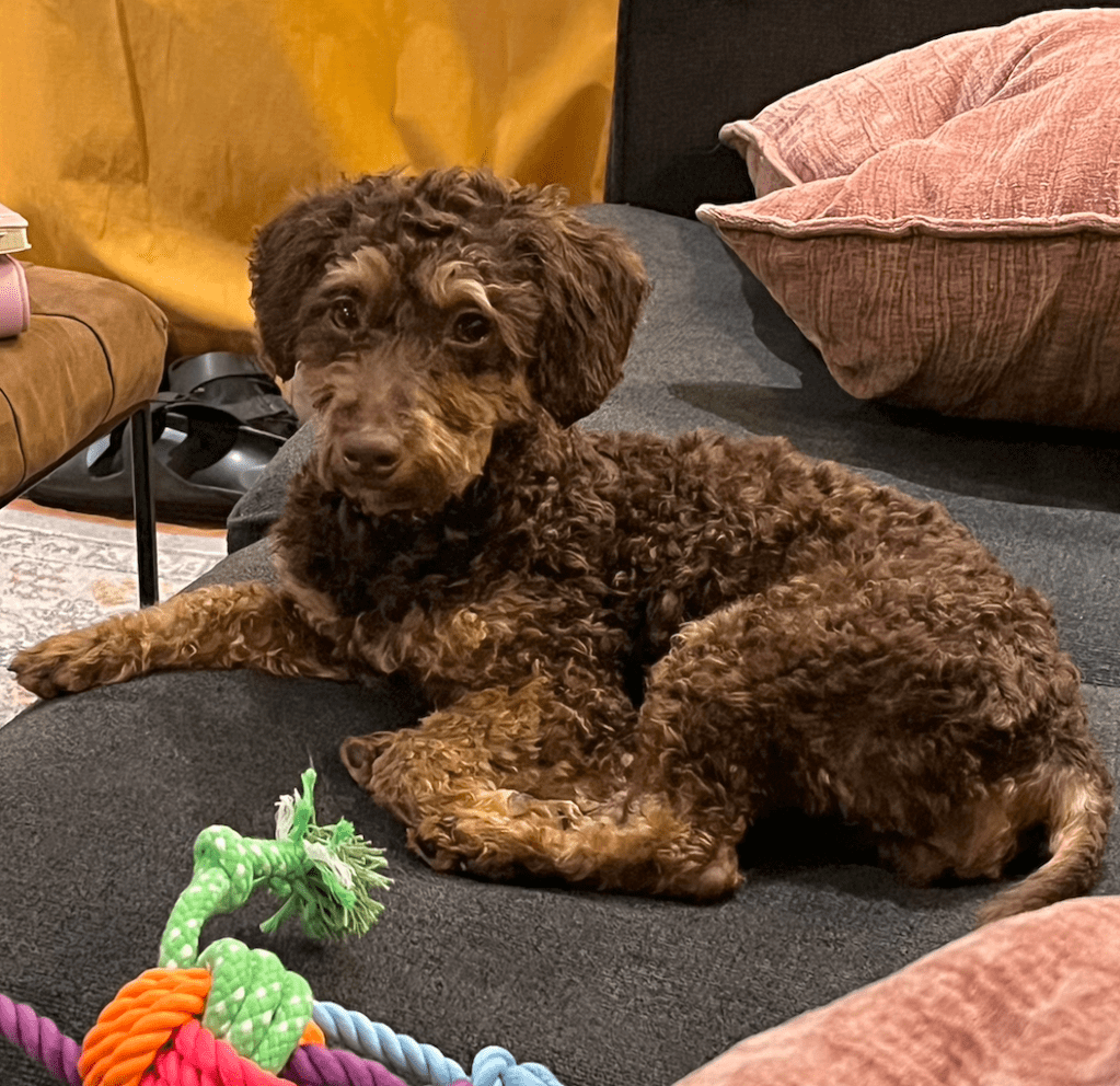 Mocha Montague began her position in February 2025 after previously interning at All 4 The Dogs Rescue. The 1-year-old Mini Shnoodle has no previous professional experience, but she is a quick learner with a go-getter attitude and has already made a big impact. Mocha’s hobbies include laying on fuzzy blankets, running in circles, and growling at herself in the mirror.